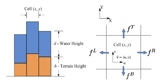 Outflow computation: $$f^L_{t+\Delta t}(x,y) = \max\left(0, f_t^L(x,y) + \Delta t \cdot A \cdot {g \cdot \Delta h^L (x,y) \over l} \right)$$
